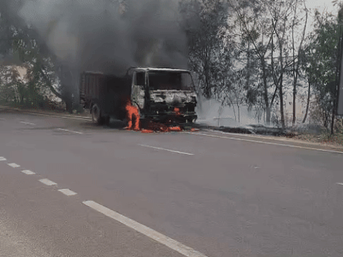 गुरुग्राम में सीमेंट से भरे ट्रक में लगी भीषण आग, ड्राइवर ने कूदकर बचाई जान